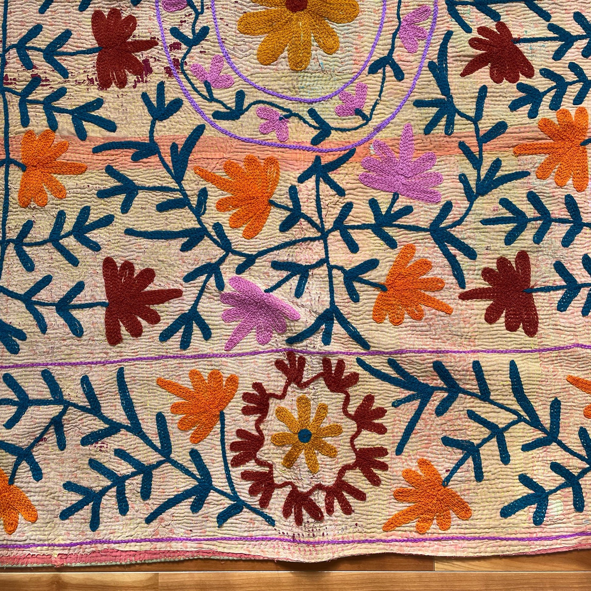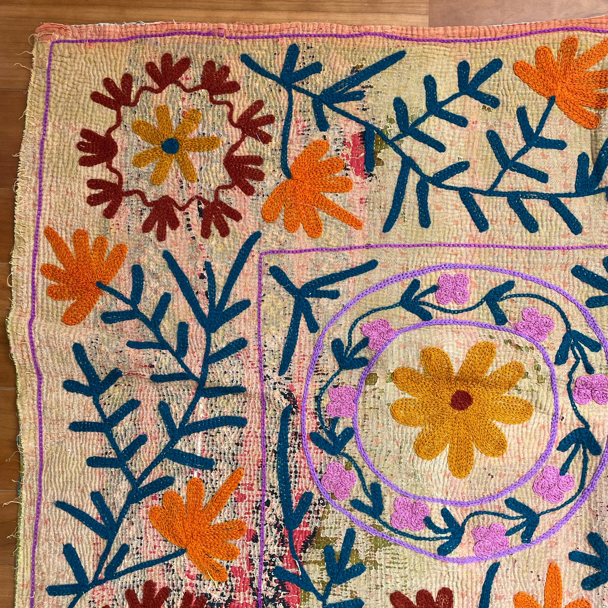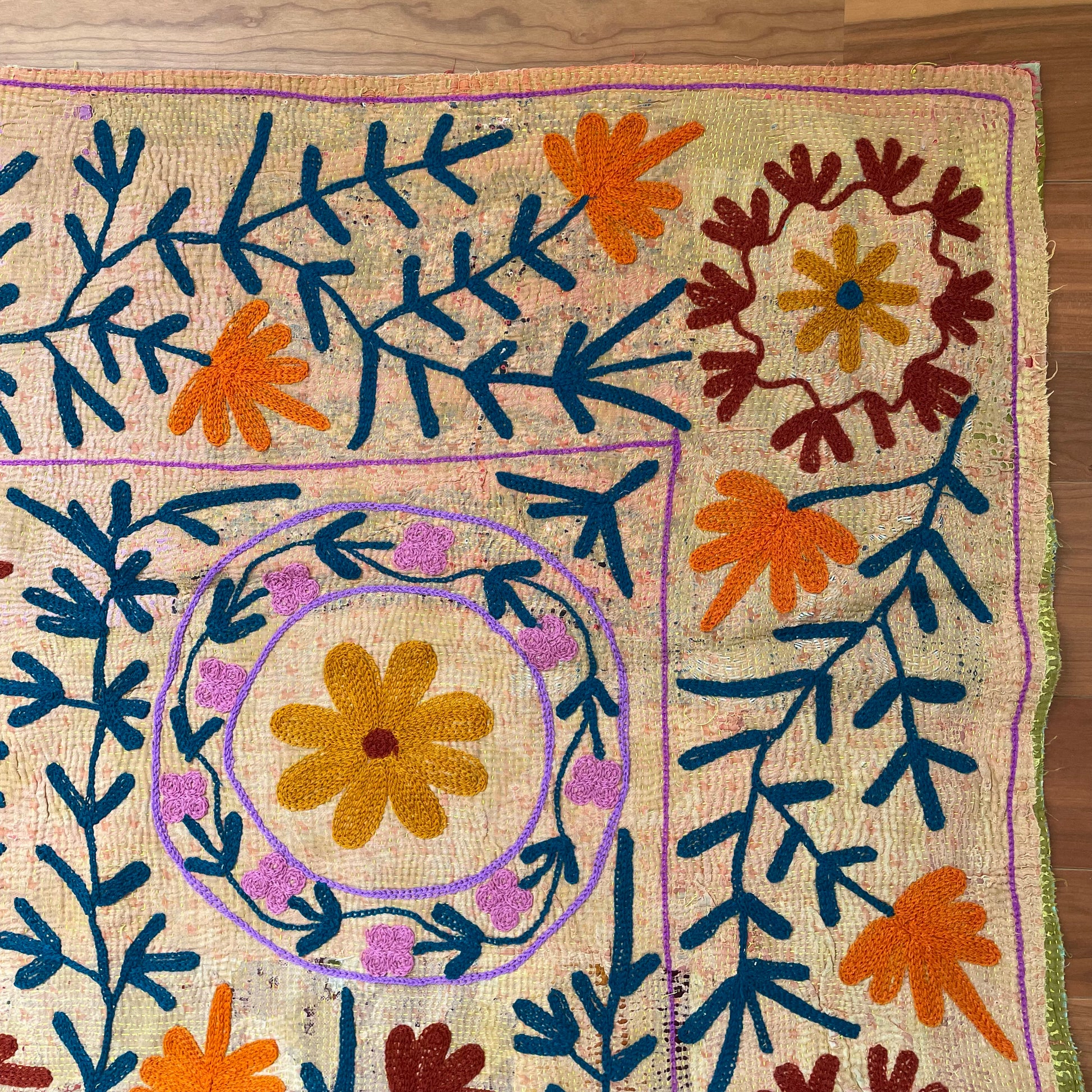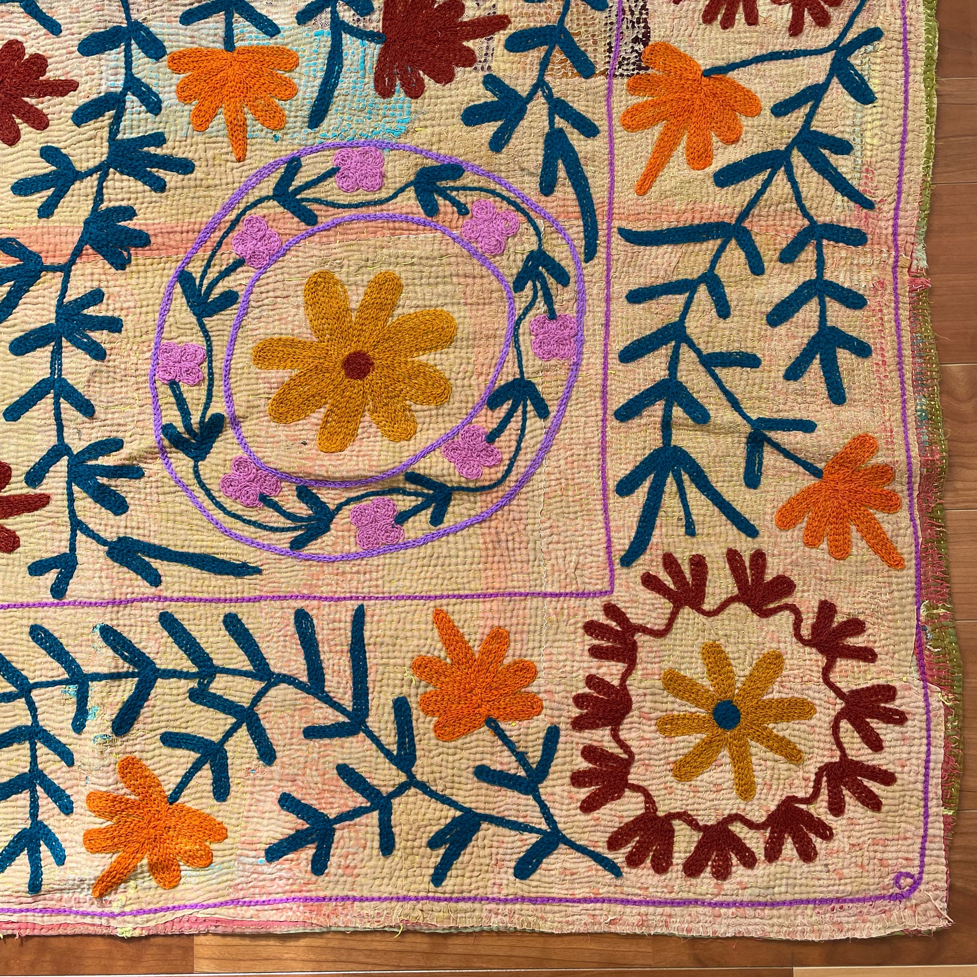 スザニ刺繍が施されたカンタキルトになります。ヴィンテージのカンタキルトを重ねて1枚のキルトにした後にスザニ刺繍を施しています。インド発祥のカンタキルトとウズベキスタン発祥のスザニ刺繍が組み合わさった素晴らしい伝統工芸です。