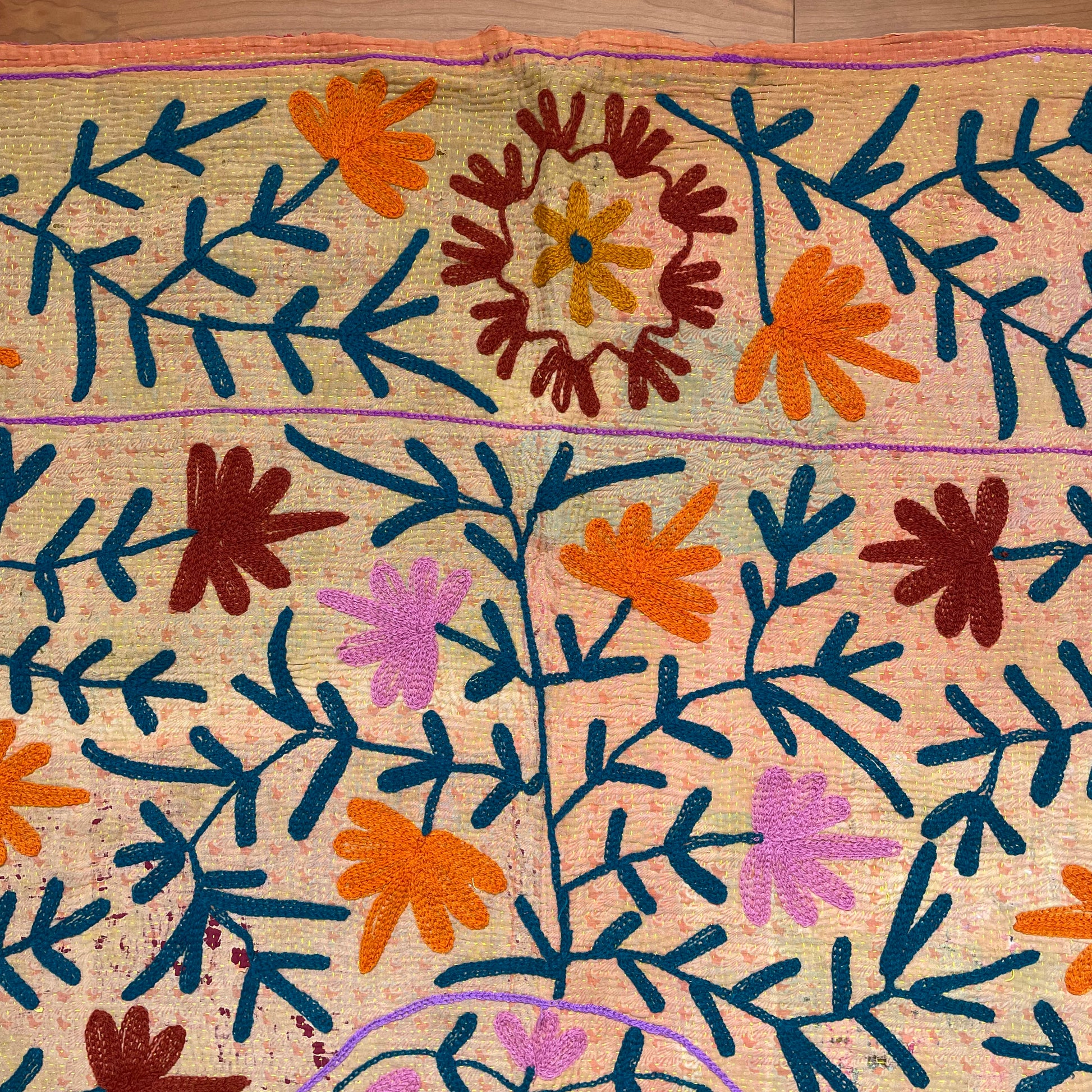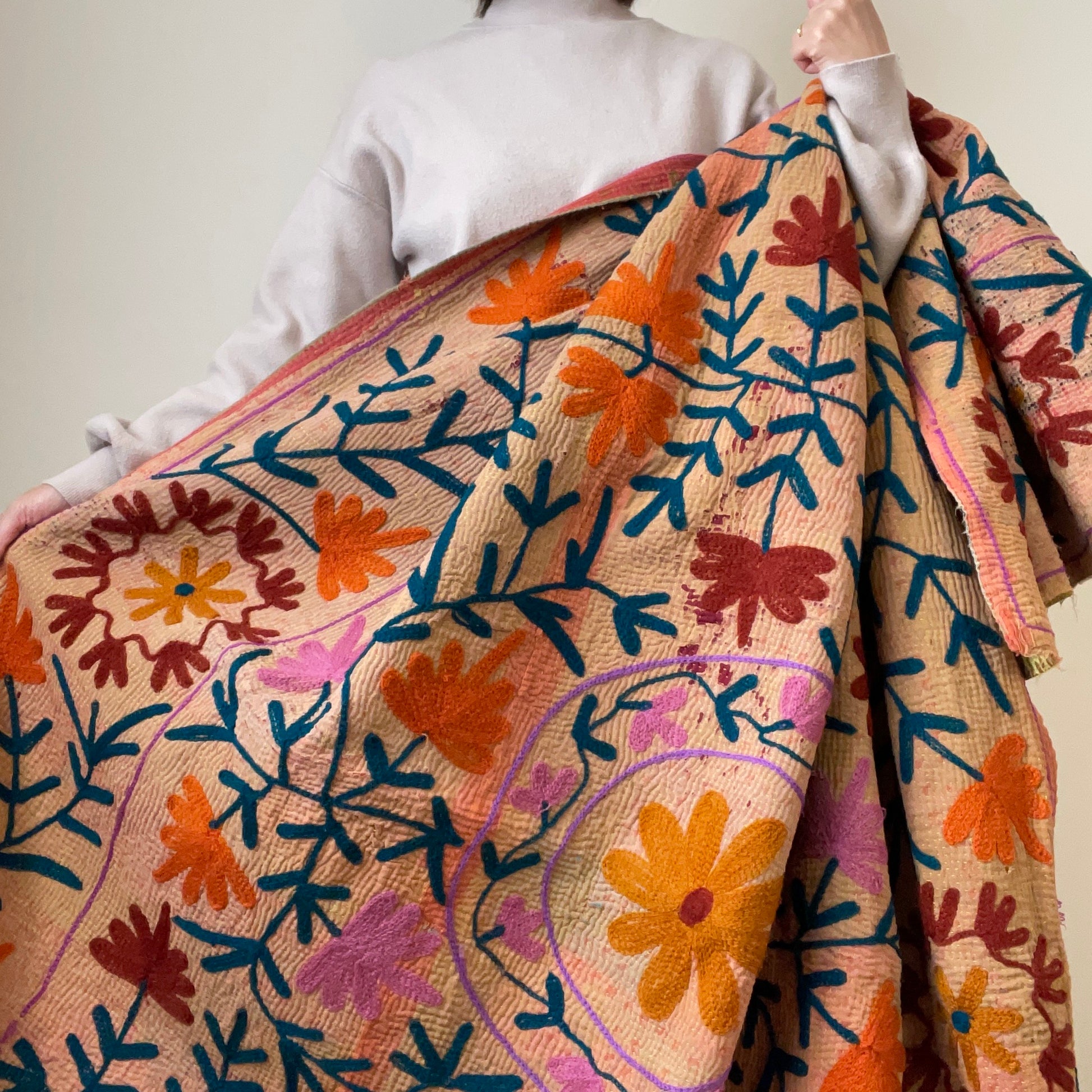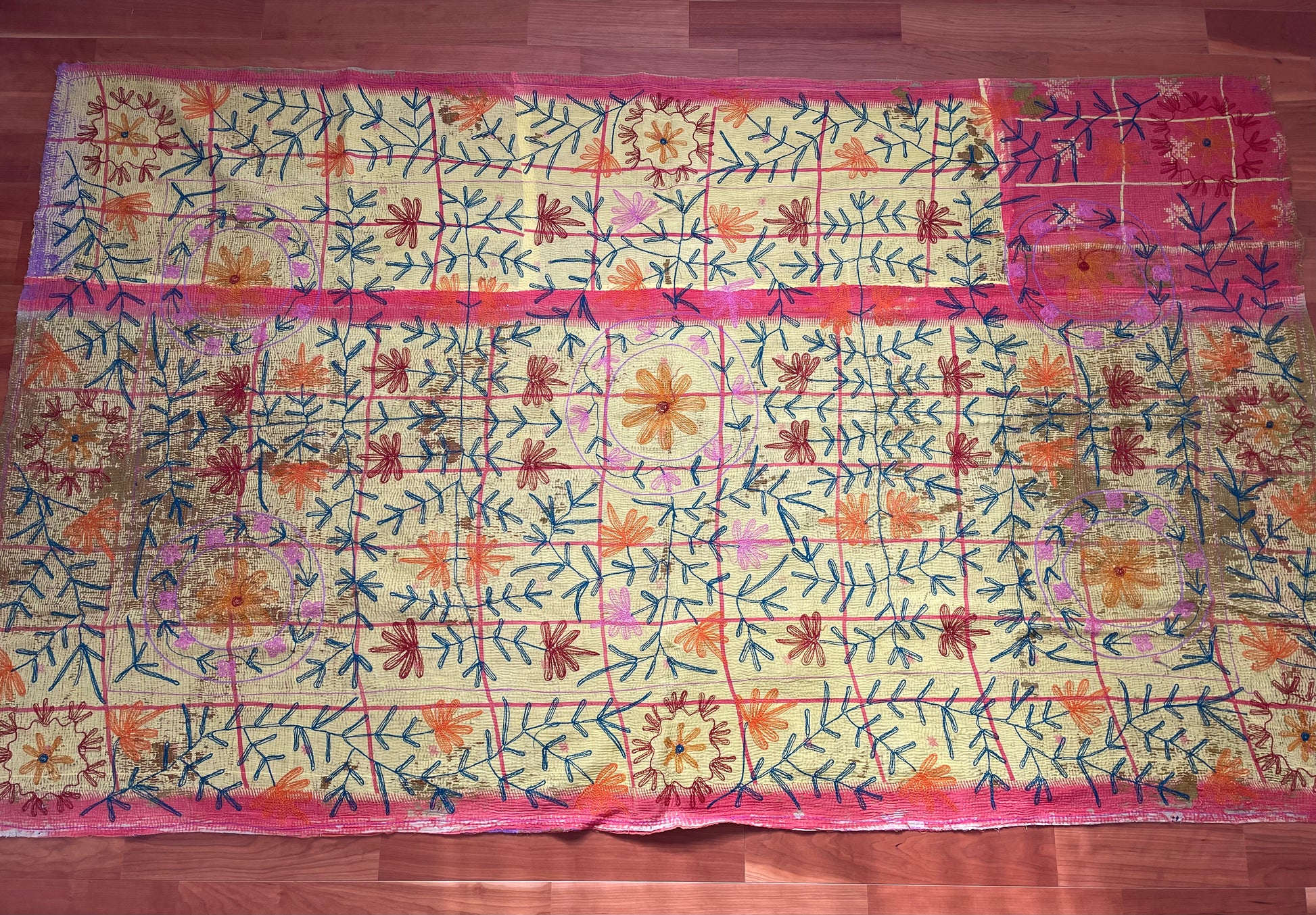 スザニ刺繍が施されたカンタキルトになります。ヴィンテージのカンタキルトを重ねて1枚のキルトにした後にスザニ刺繍を施しています。インド発祥のカンタキルトとウズベキスタン発祥のスザニ刺繍が組み合わさった素晴らしい伝統工芸です。