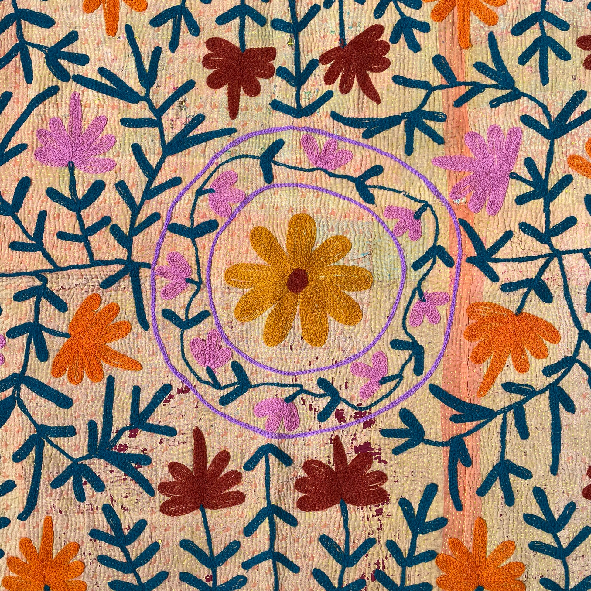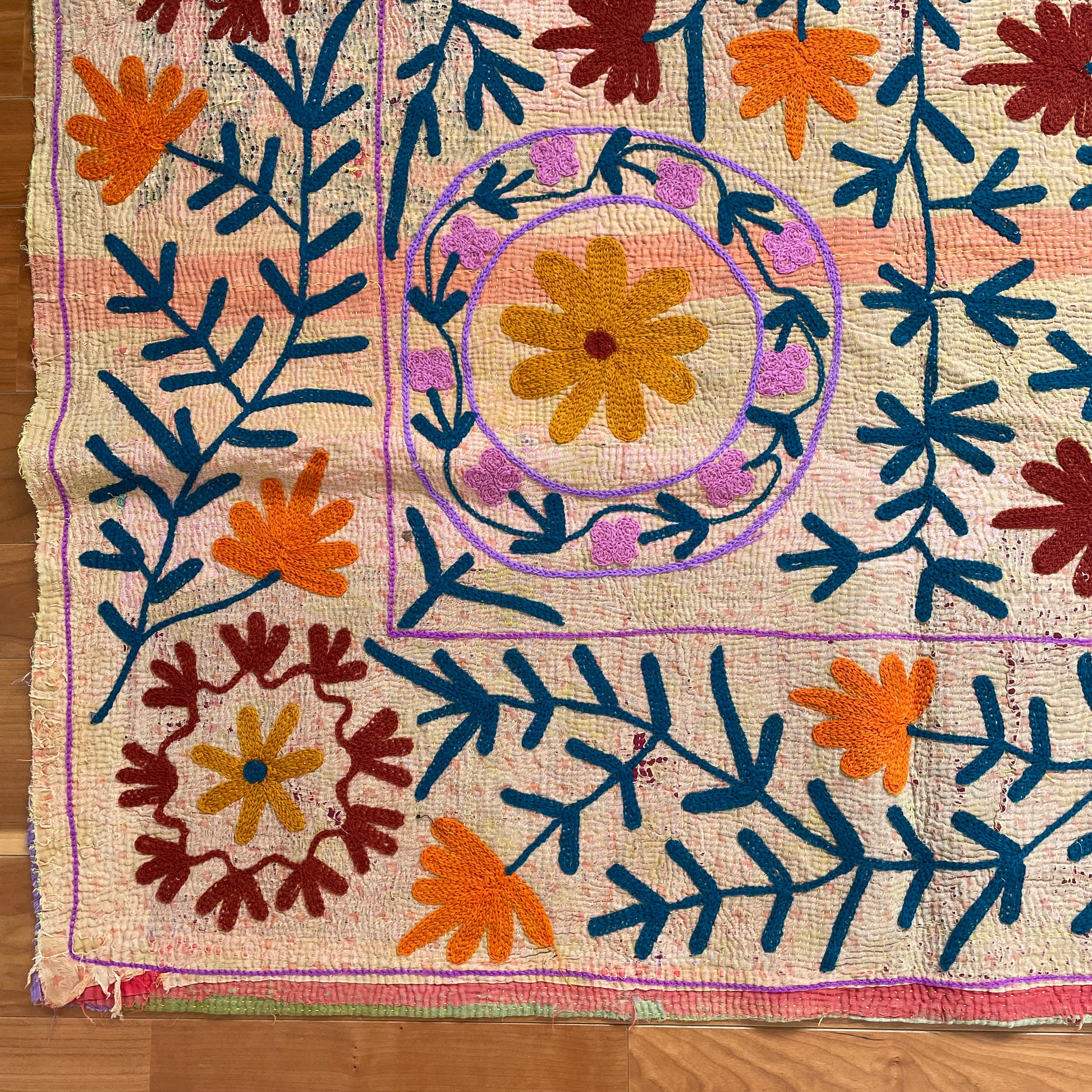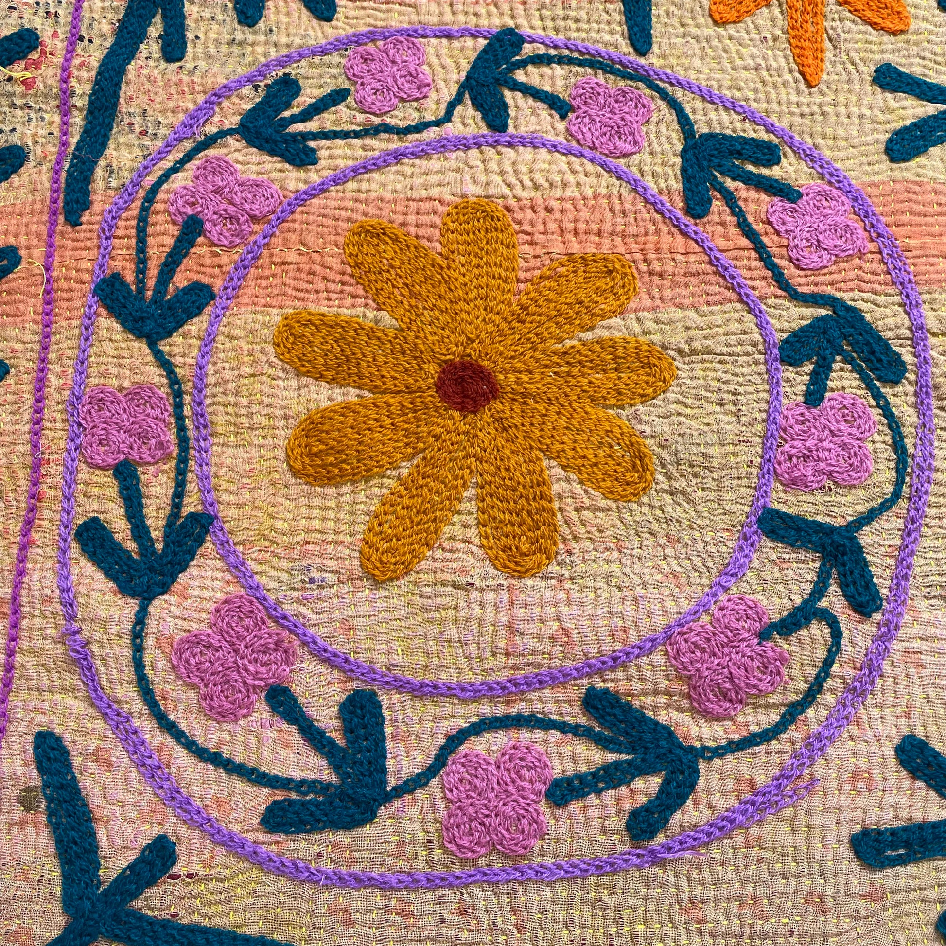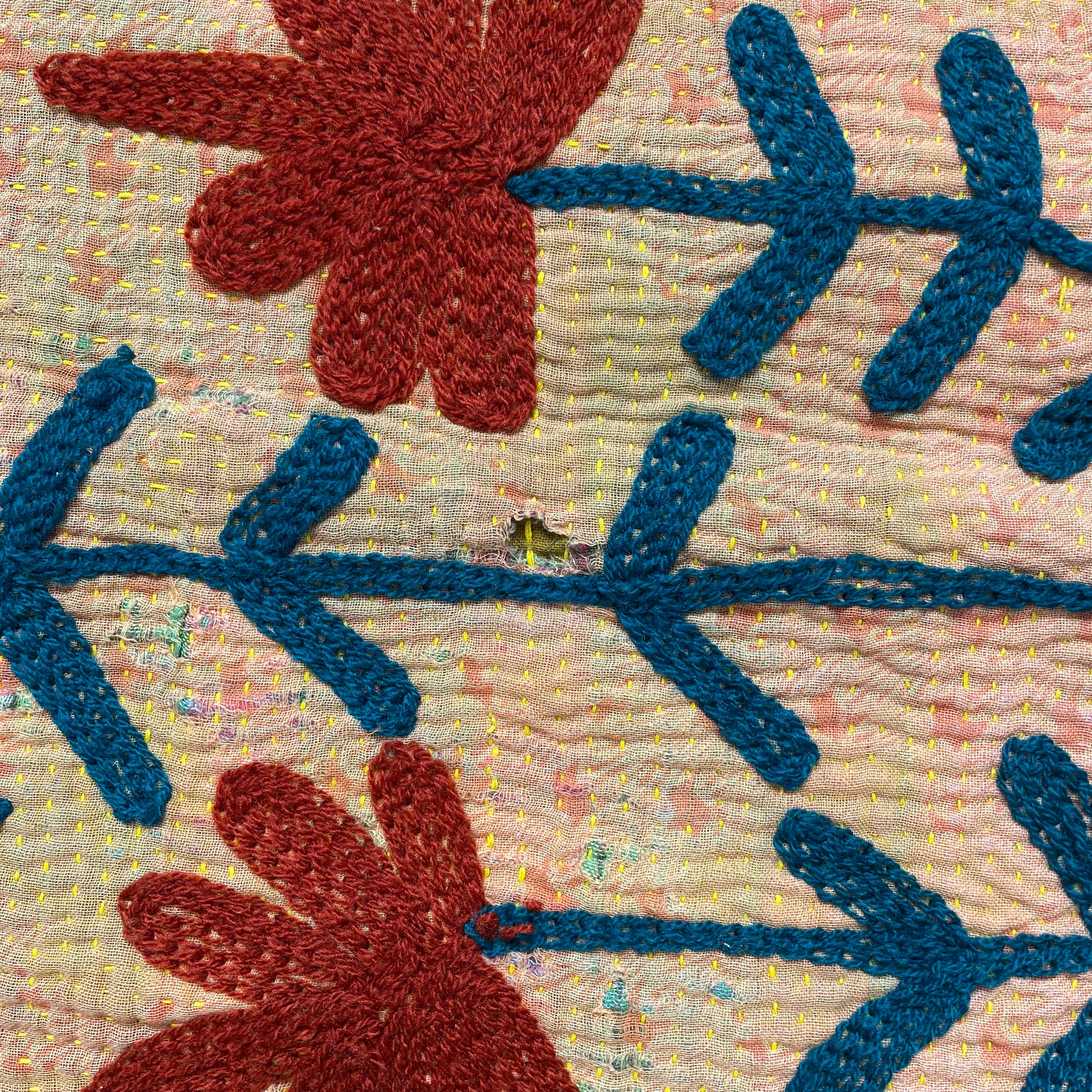 スザニ刺繍が施されたカンタキルトになります。ヴィンテージのカンタキルトを重ねて1枚のキルトにした後にスザニ刺繍を施しています。インド発祥のカンタキルトとウズベキスタン発祥のスザニ刺繍が組み合わさった素晴らしい伝統工芸です。