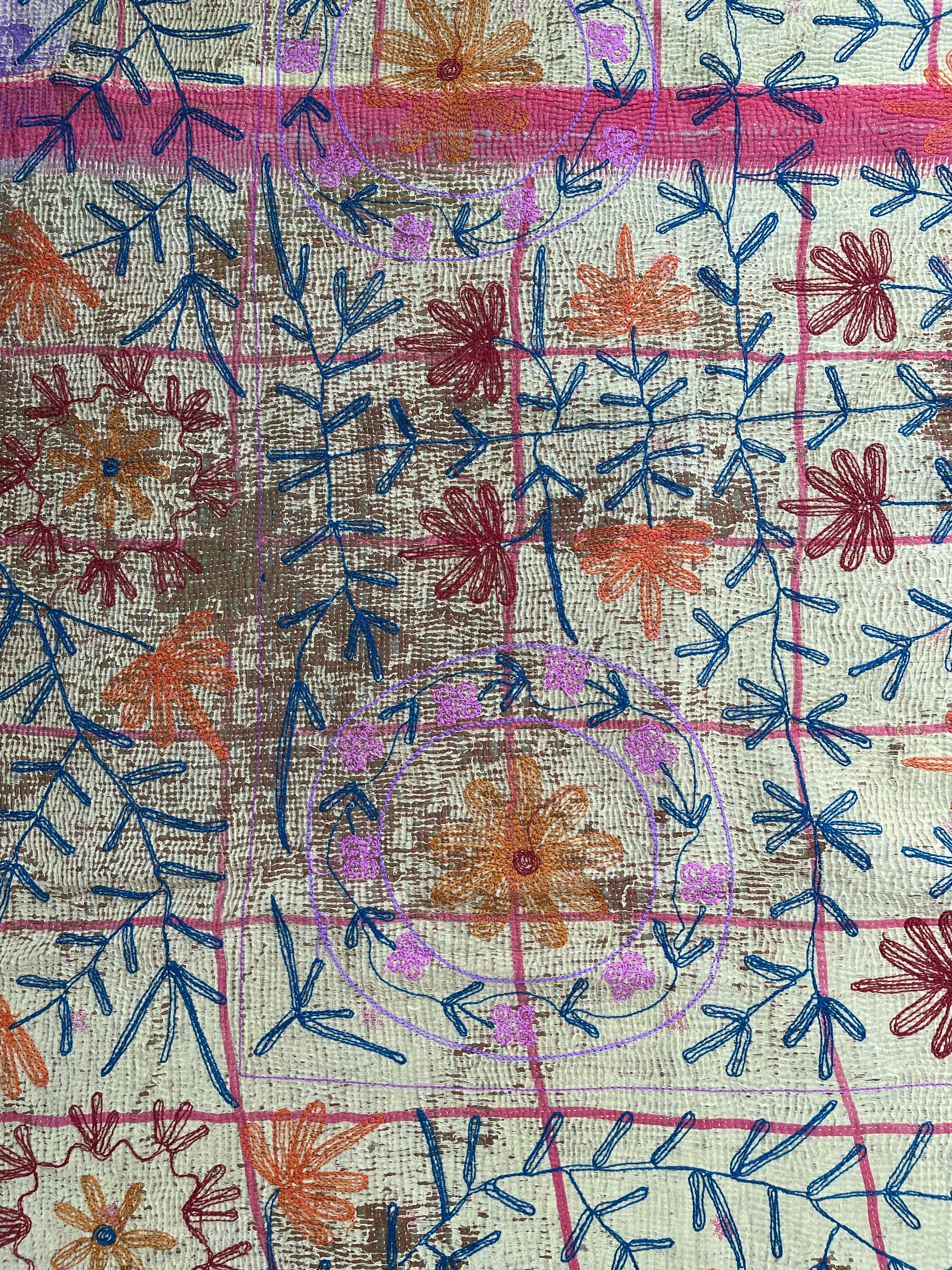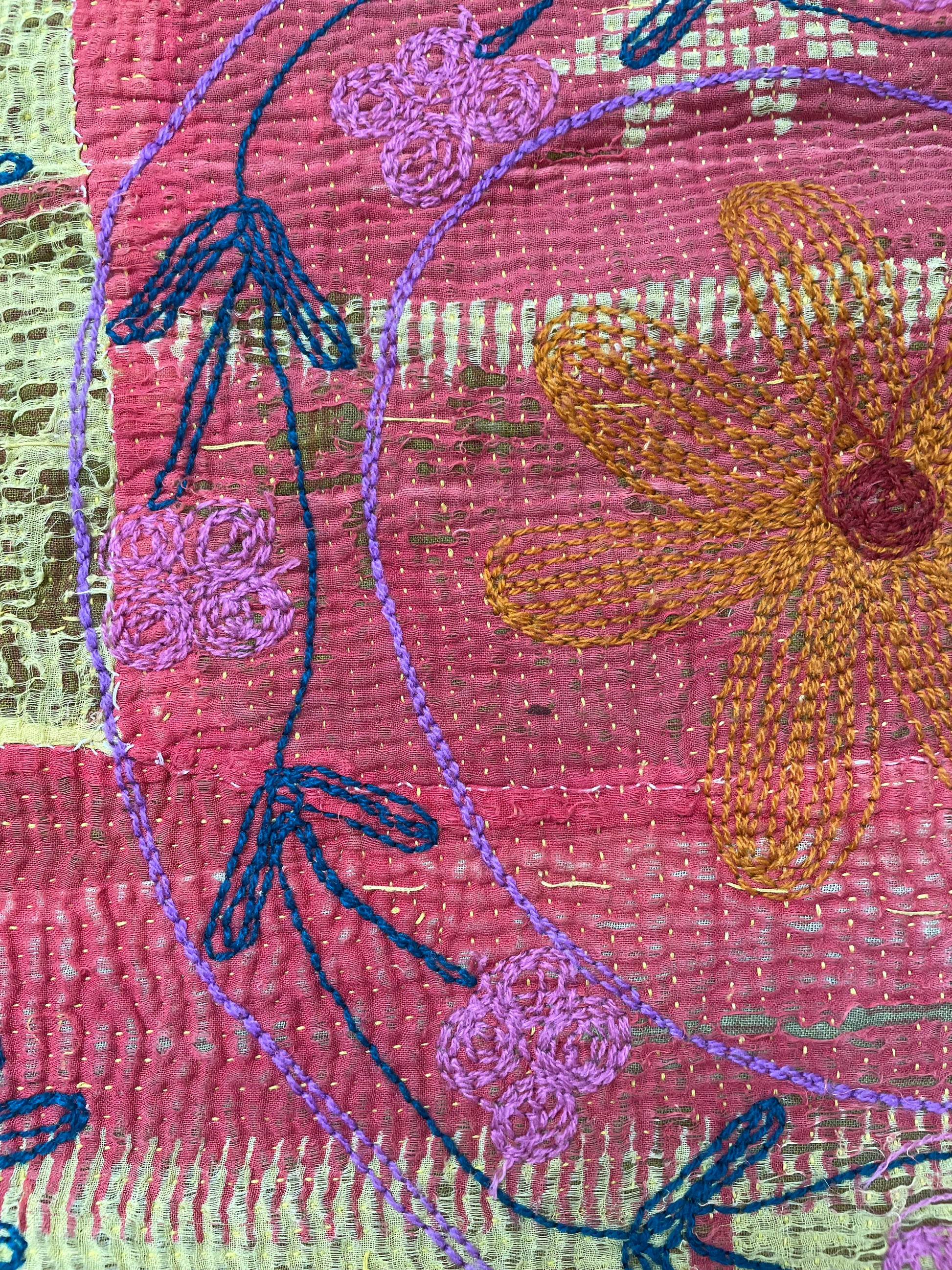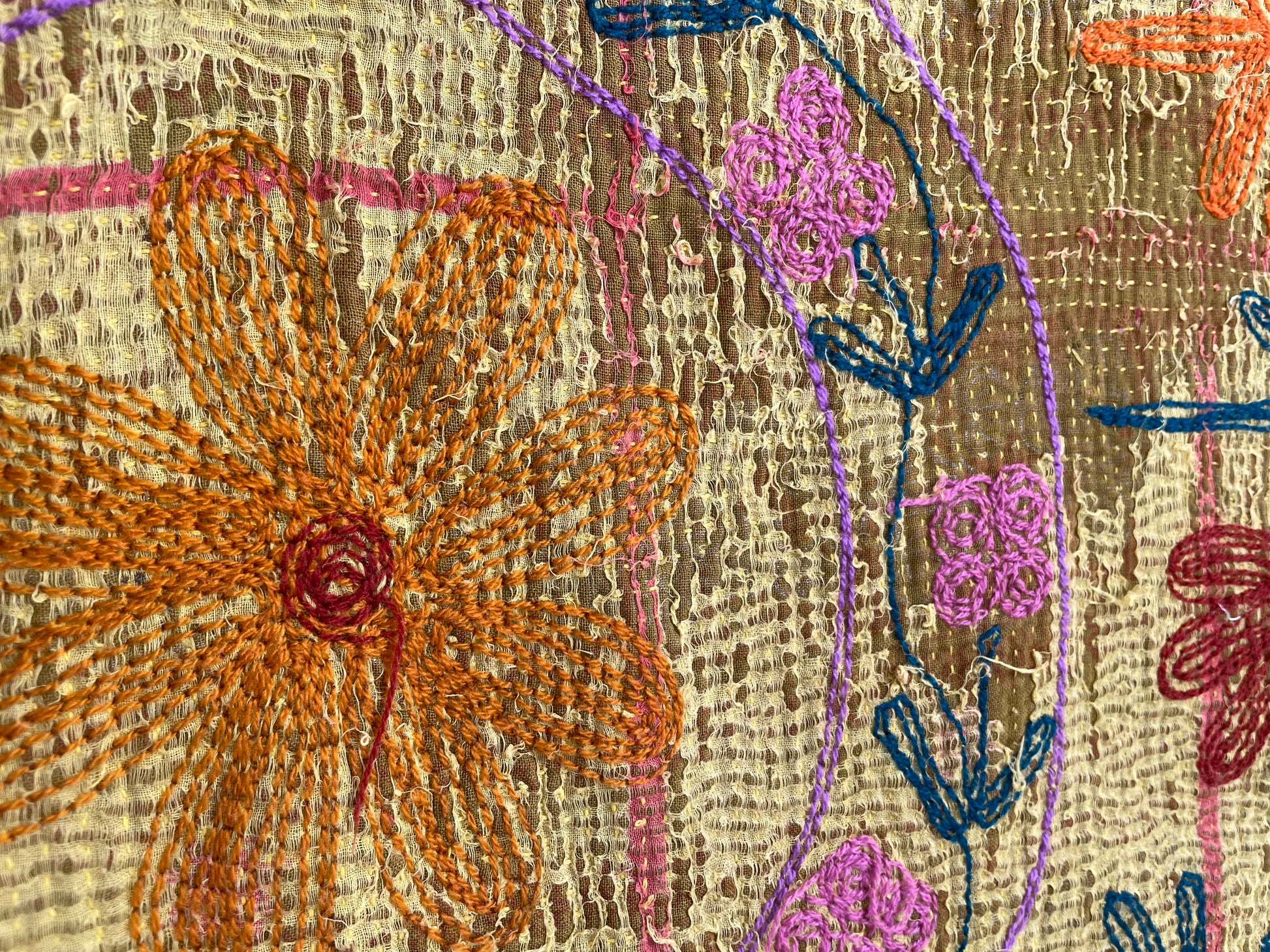 こちらは何十年も前のヴィンテージのサリーを重ね合わせてキルトにしたものをスザニ刺繍の生地として使用しています。