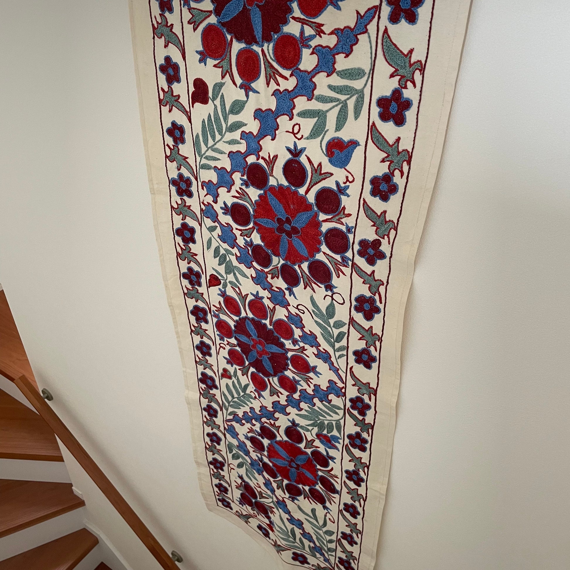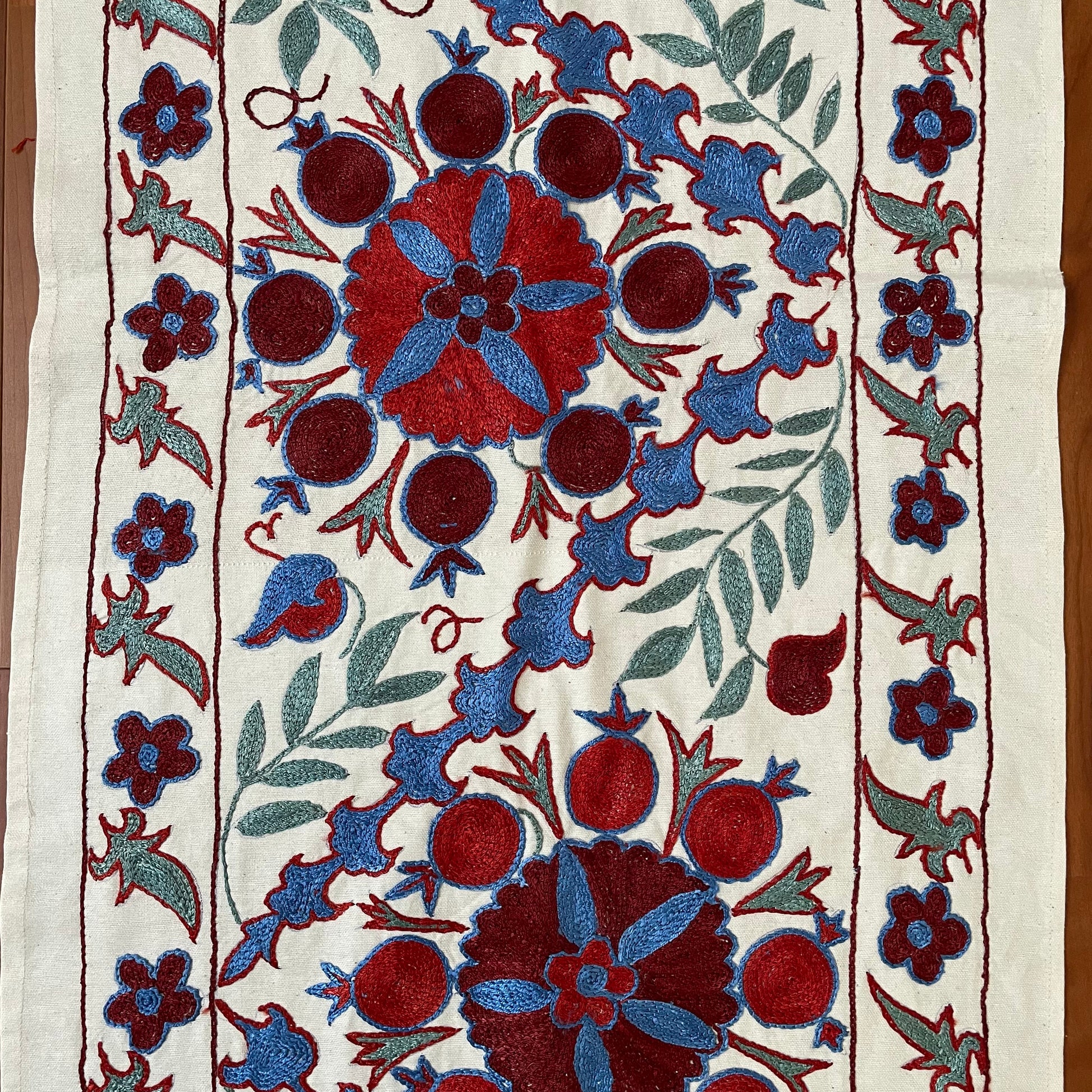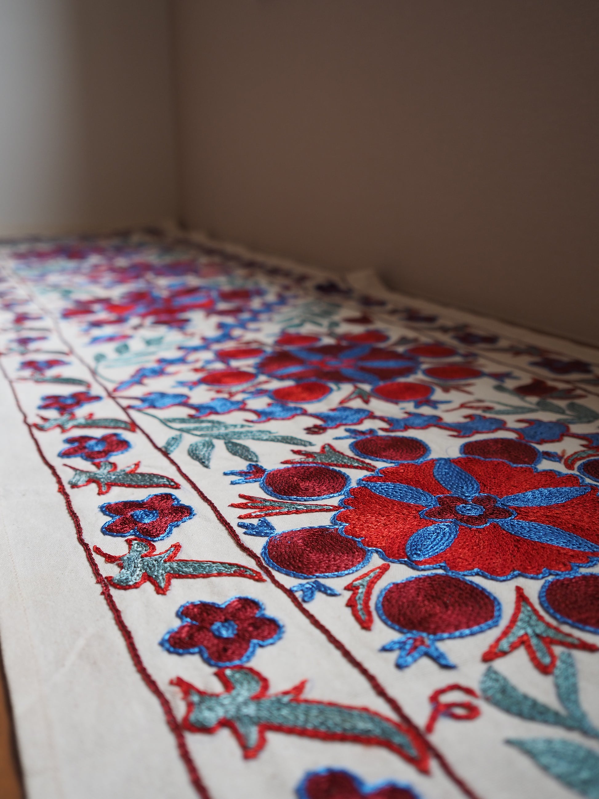 こちらはスザニ刺繍 タペストリーになります。長さがあるのでタペストリーやテーブルランナーとしてお楽しみいただけます。白い生地にフラワーモチーフのデザインがとても美しい1枚です。生地の中央部分には大きなフラワーモチーフのデザインがあり、存在感が合って綺麗です。定番のモチーフであるザクロの刺繍も施されています。さっとテーブルの上に掛けてもとてもおしゃれです。棚の上に掛けていただいたり、観葉植物の下に敷いていただいてもとても素敵だと思います。