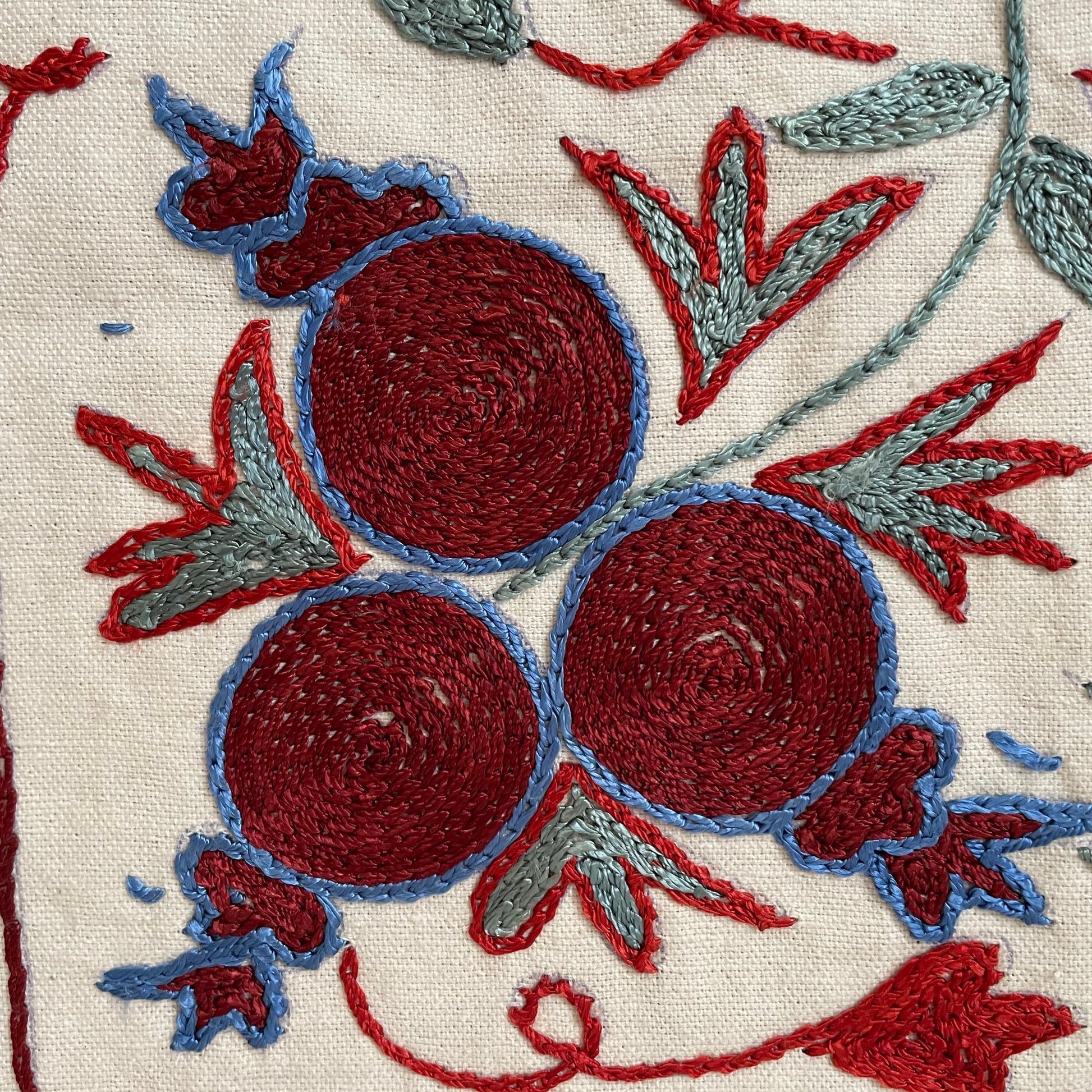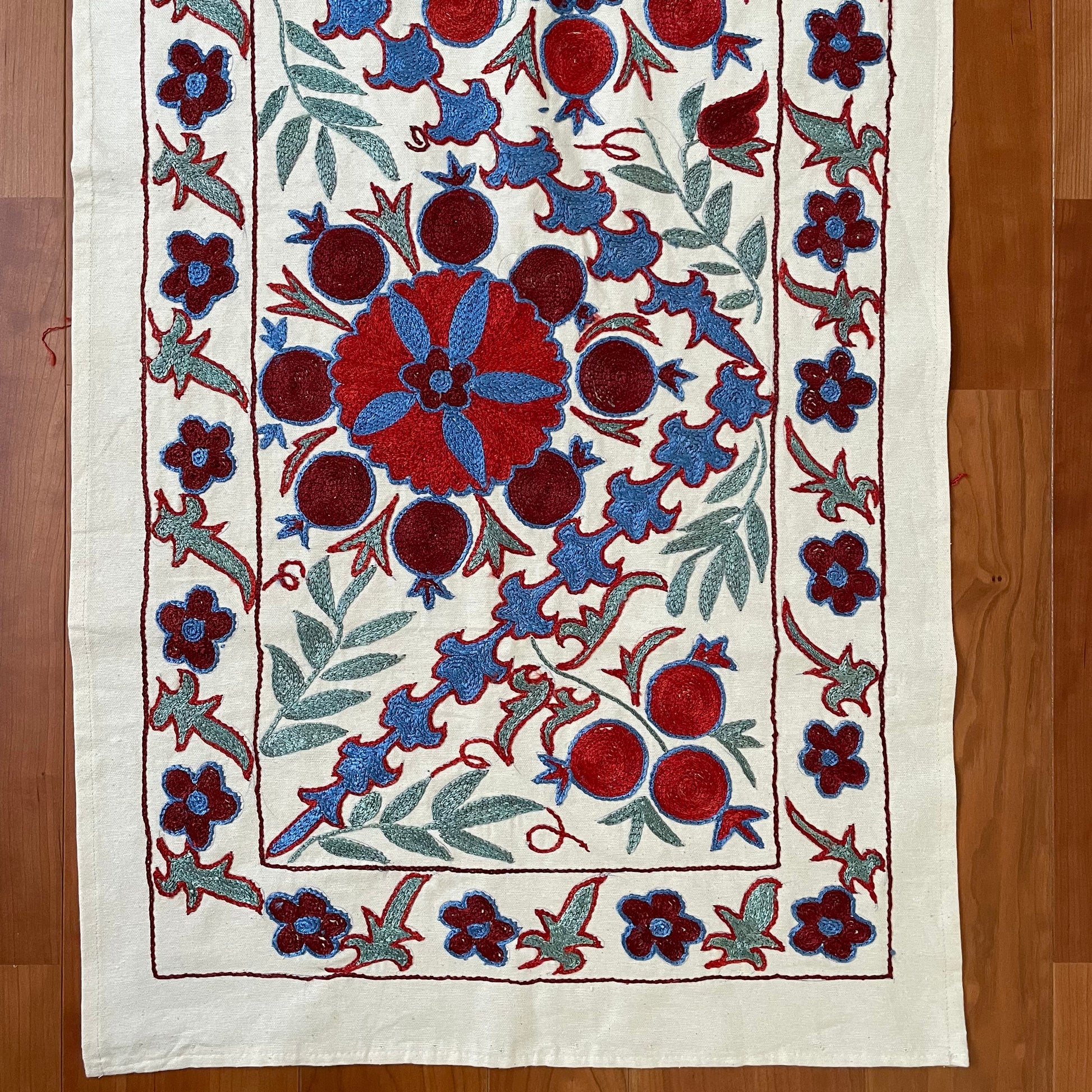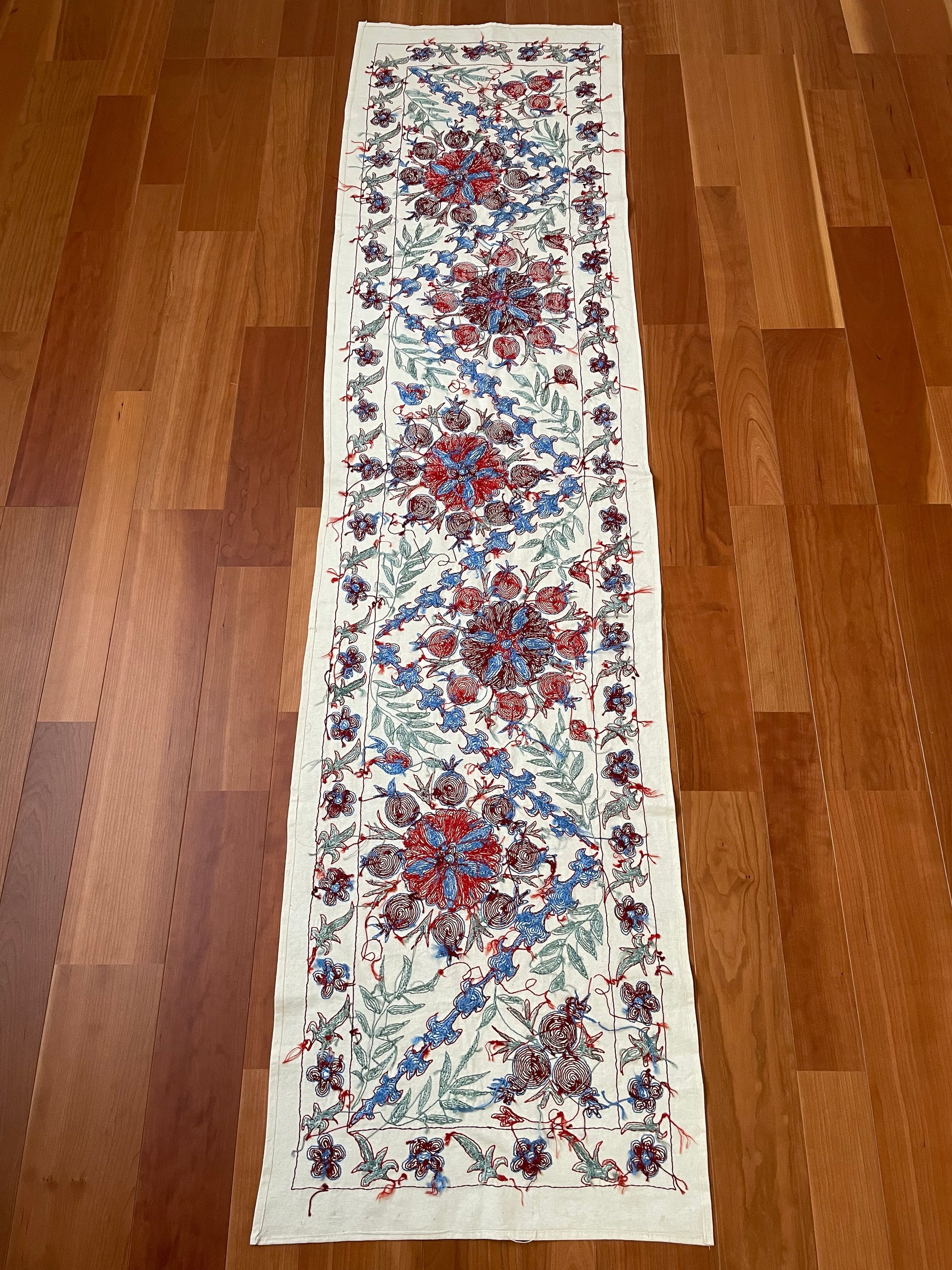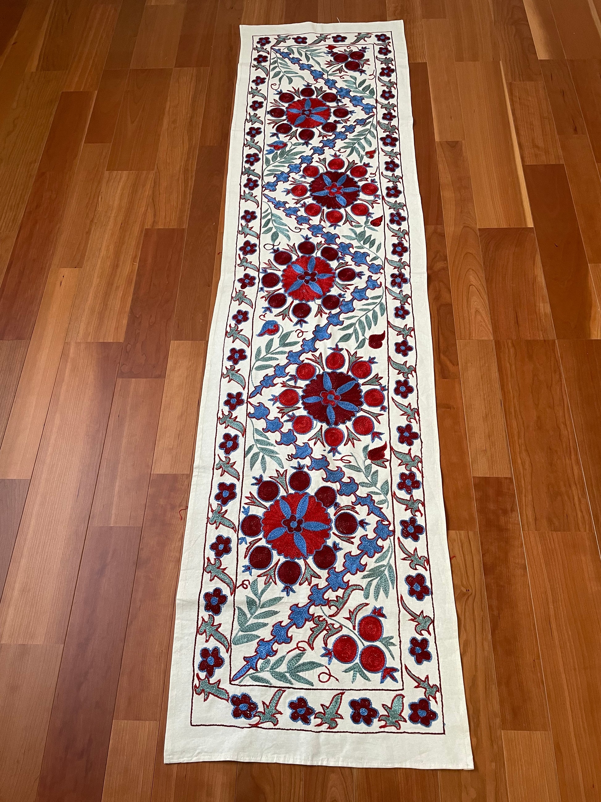 こちらはスザニ刺繍 タペストリーになります。長さがあるのでタペストリーやテーブルランナーとしてお楽しみいただけます。白い生地にフラワーモチーフのデザインがとても美しい1枚です。生地の中央部分には大きなフラワーモチーフのデザインがあり、存在感が合って綺麗です。定番のモチーフであるザクロの刺繍も施されています。さっとテーブルの上に掛けてもとてもおしゃれです。棚の上に掛けていただいたり、観葉植物の下に敷いていただいてもとても素敵だと思います。